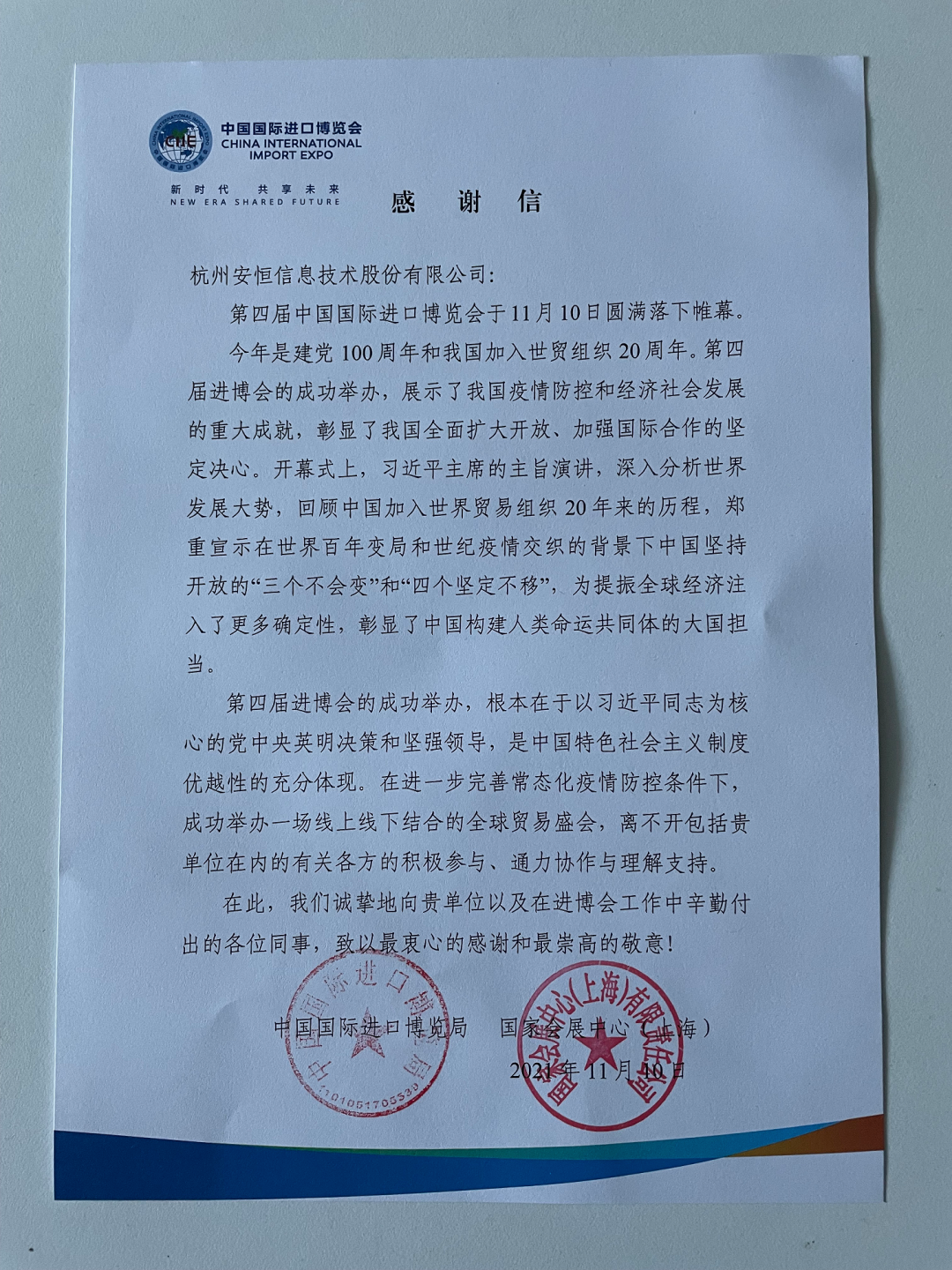 沉甸甸!来自进博会官方的感谢信