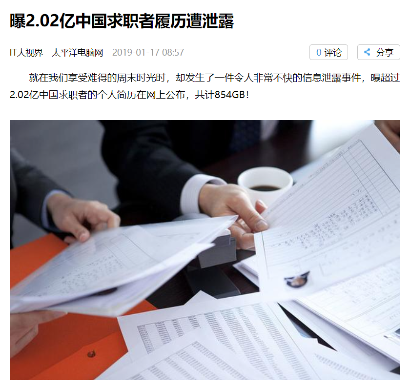 由于数据库存在不安全的配置,导致2.02亿中国求职者的信息被公开,包括姓名、生日、手机号码、邮箱、婚姻状况、政治面貌和工作经历等个人数据,可以直接从BinaryEdge或Shodan中搜索到,没有任何密码保护,文件共计854GB。