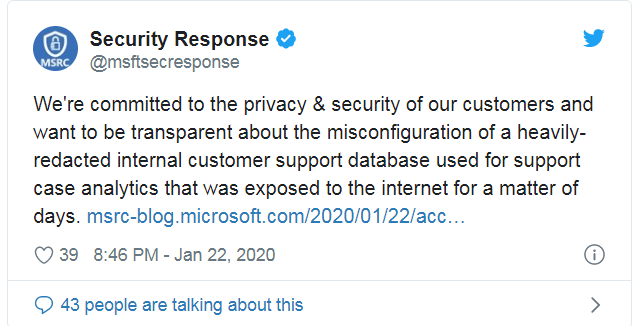 据微软发布的公告称,数据泄露的具体原因是“数据库网络安全组进行的更改中含有配置不当的安全规则”。此次事件曝光了微软2.5 亿条客户服务和支持记录,泄露了客户邮箱、IP地址、地理位置、CSS声明等。