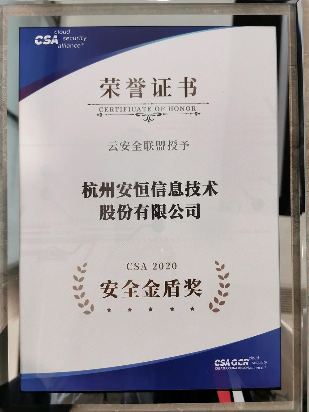 安恒信息作为首批加入CSA联盟的成员单位,参与协办本次大会,并获得云安全联盟大中华区颁发的“CSA GCR 五周年贡献奖”、“CSA 2020安全金盾奖”两项殊荣。