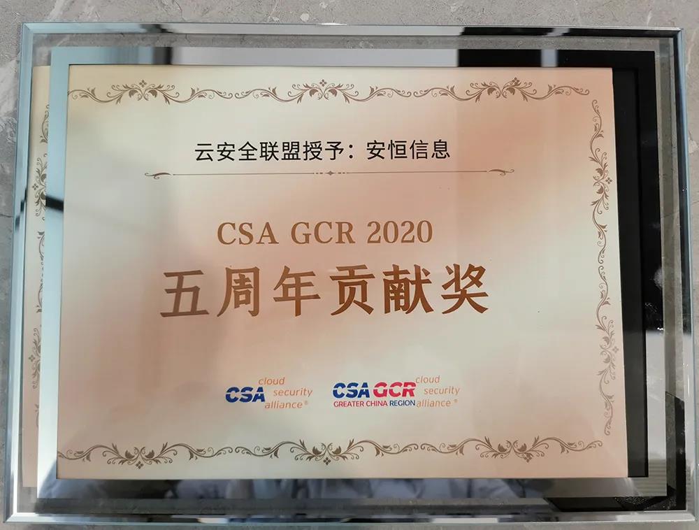 其中,CSA GCR 5周年贡献奖是对加入联盟5年的成员单位,一直以来参与联盟的工作与活动的表彰。自2015年6月正式加入联盟以来,安恒信息积极参与联盟工作,加强与其他联盟成员们合作交流,共同促进云安全技术的发展和进步。