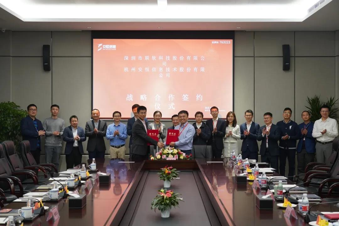联软科技董事长兼首席技术官王志及安恒信息高级副总裁张小孟代表双方正式签订战略合作协议。