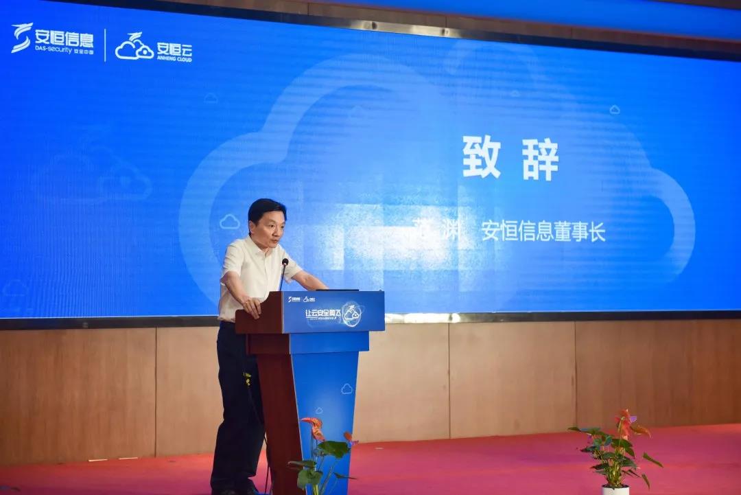 安恒信息董事长范渊为整场发布会开篇致辞,他提到,早在2013年公司将云安全作为公司战略发展方向之一,也取得了一定的成果,风暴中心SaaS服务为22万余家网站提供云安全服务,天池云安全平台为200+朵私有云提供整体安全资源池服务,云堡垒机、云Waf等安全产品在国内十余个主流公有云平台上线。