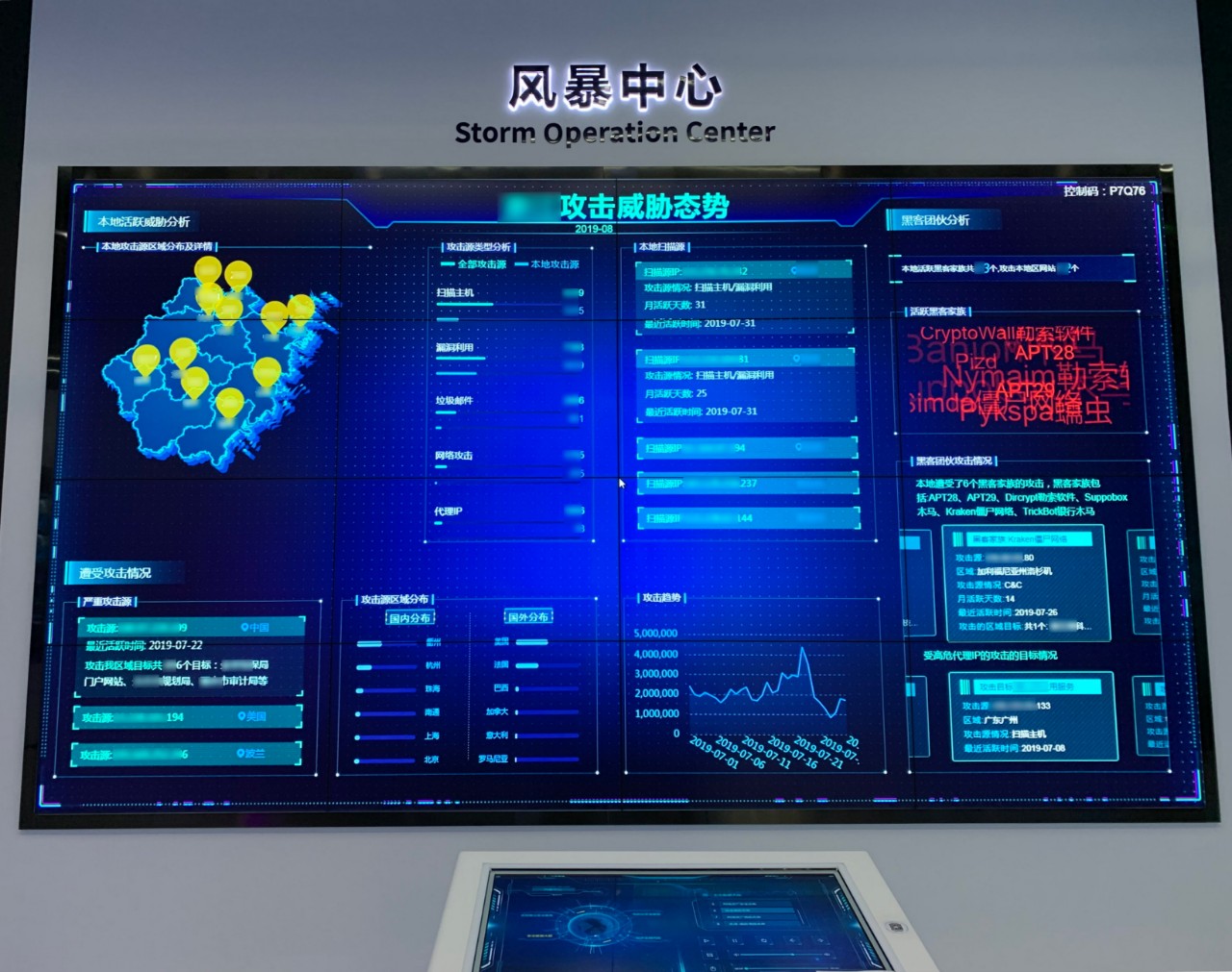 目前,省市级威胁情报全息大屏的交互体验区,位于安恒大厦一楼创新体验中心的风暴中心版块。