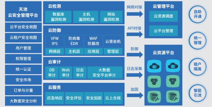 打造主机、网络、应用、数据多层次安全保障的云基础环境,并从外部攻击防御和内部安全管控两方面整体提升云安全水平。