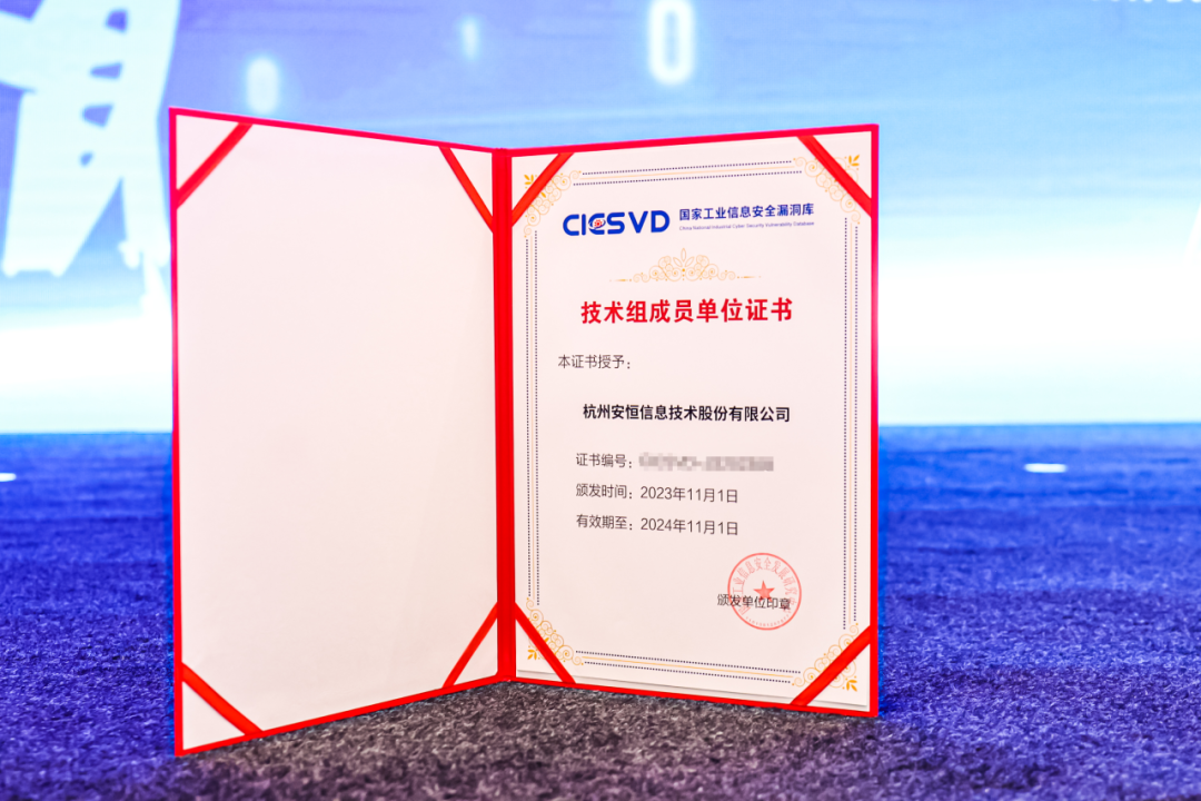 在大会期间,安恒信息凭借自身在工业信息安全领域的技术实力和对联盟工作的支持,荣获了国家工业信息安全漏洞库技术组成员单位和2023年度工业信息安全产业发展联盟优秀技术支撑单位的称号。