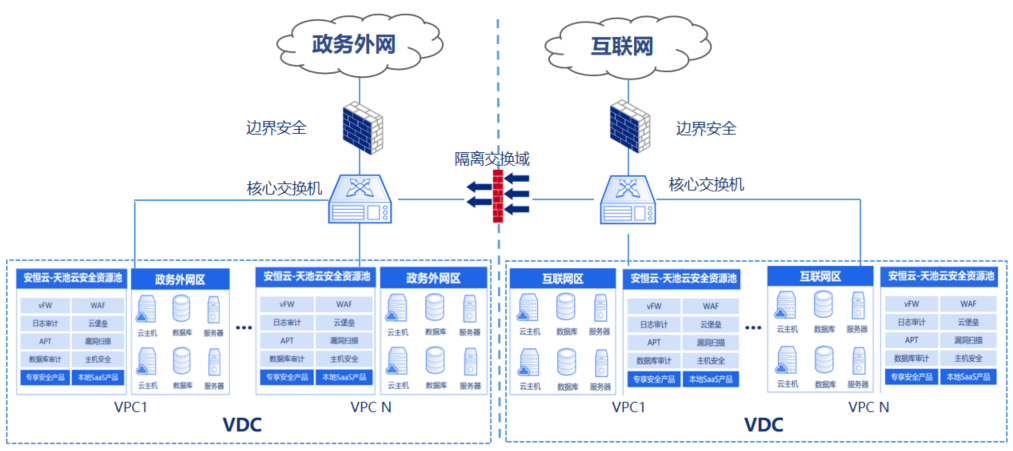 特点2:租户自服务,权责明确:各委办局按需申请和开通云安全服务能力,对应的安全能力自动部署到委办局归属的VDC网络内,继而实现对云上业务/应用/网络的安全保护。