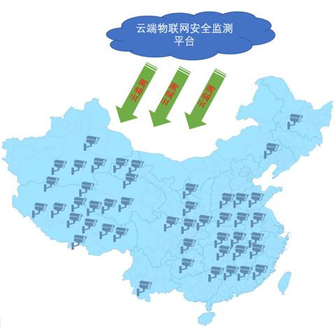 针对本地区资产情况与风险情况,鉴于当前疫情时期,可以优先采用安恒信息云端物联网安全监测平台进行安全检查,彻底理清辖区视频监控资产情况,并提供安全分析报告。其工作模式如图: