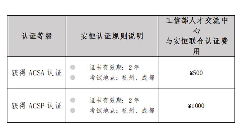 通过不同认证等级考试后,即可获得相应的“安恒认证证书” ,同时学员可选择获取“工信部人才交流中心与安恒联合认证证书”,认证具体规则如下表所示: