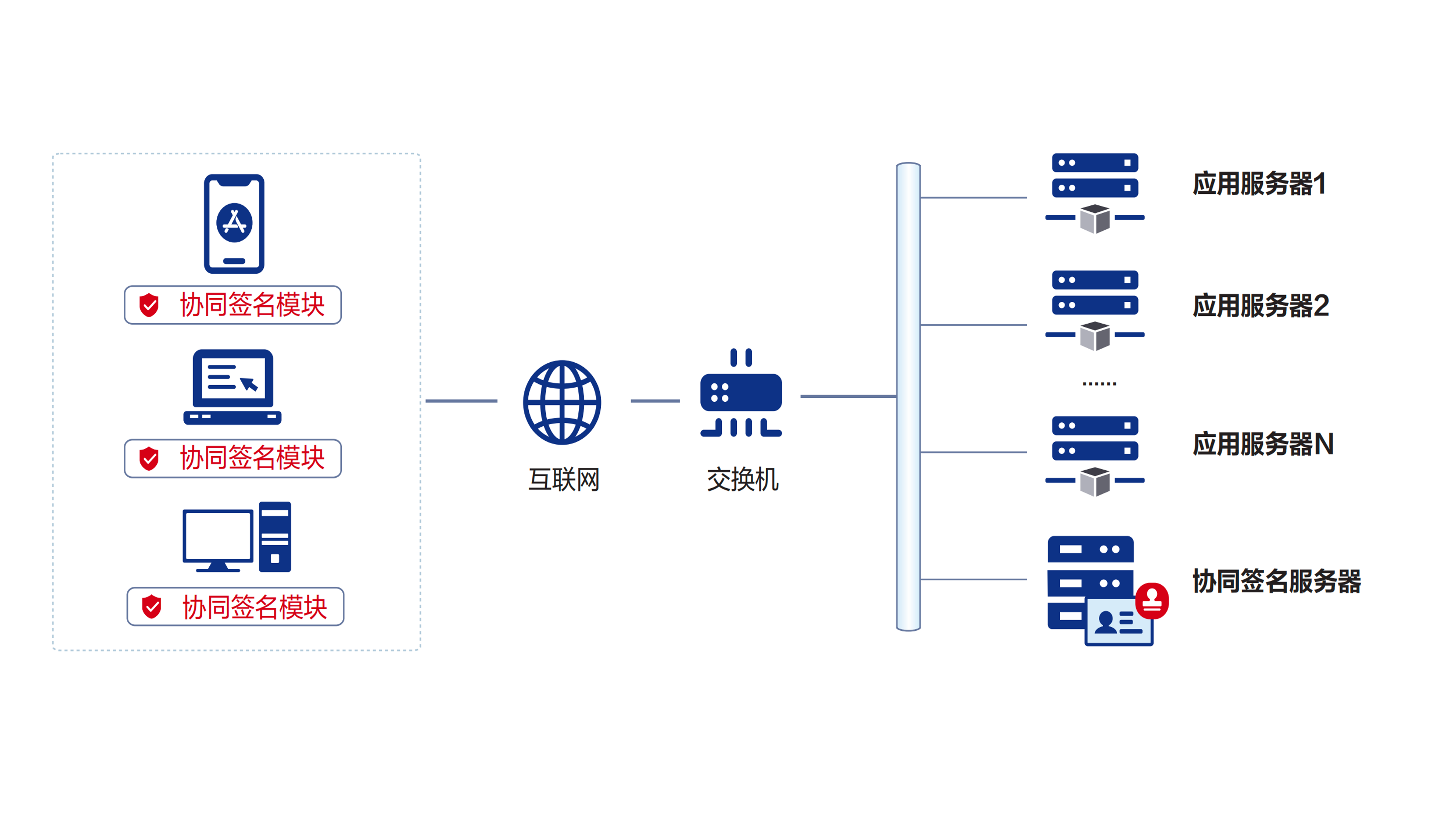 协同签名系统主要针对移动端用户身份鉴别需求,基于商用密码算法,结合密钥分割与协同签名技术,通过移动端和服务端独立生成和存储密钥分量,经过协同运算最终得到完整签名,在保证用户使用便利性的同时,为移动终端提供安全合规的身份认证方案。