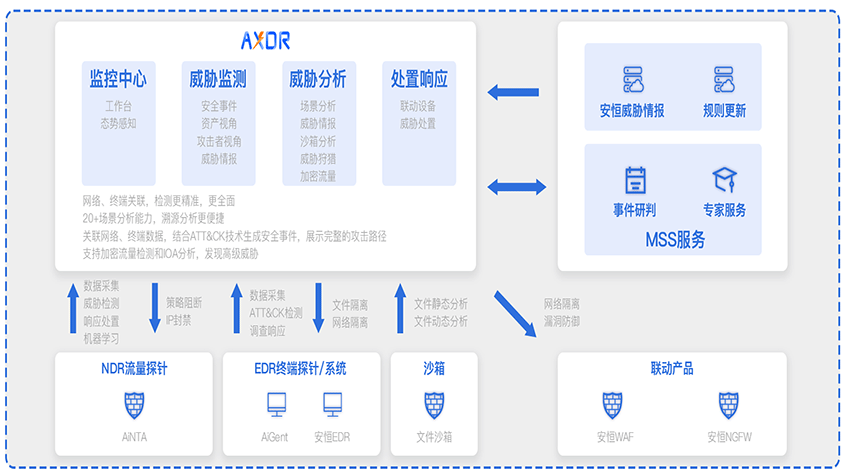 AXDR和MSS结合可以快速部署上线,实现精准防护的云安全运营。基于多种检测引擎和网端关联分析技术,AXDR能够实现精准告警助力溯源分析,便于MSS运营人员进行快速处置,共同构建稳定可靠的防护体系。